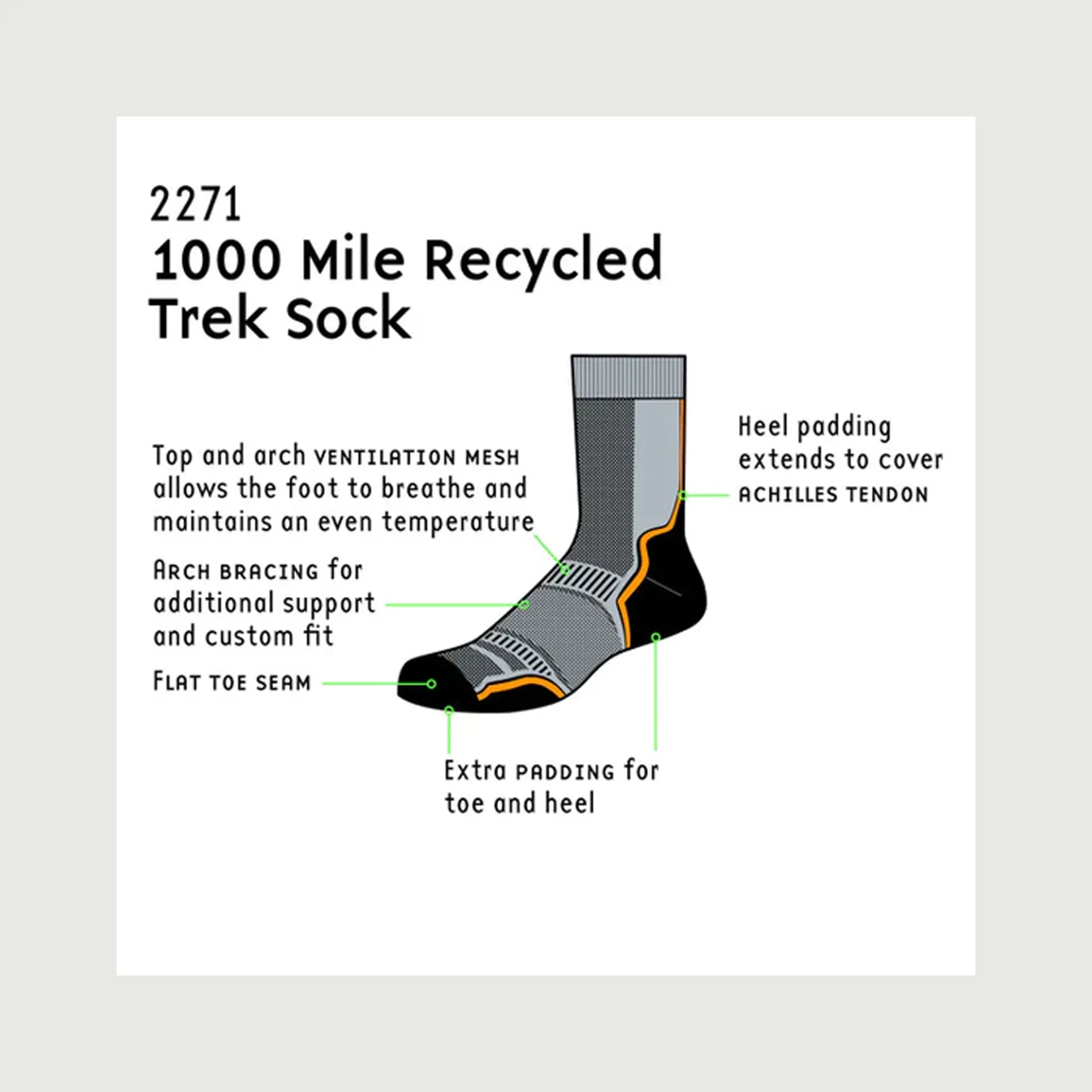 The Men's Trek Repreve Single Layer is perfect for leisure hiking, trail running, walking or mountain biking. The 1000 Mile Trek Sock is anatomically designed to give comfort and support during your leisure hours, be they spent travelling or in active sports. The padded heel extends to protect the Achilles tendon, toes and ball of the foot. Arch bracing provides a customised fit with no slippage.